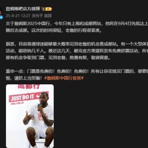 媒体提醒:詹姆斯成都行门票由官方免费提供,警惕购票骗局